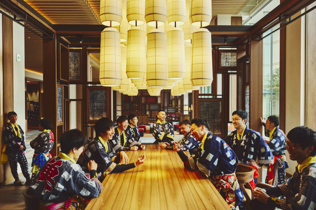 ユネスコ無形文化遺産にも登録されている犬山祭の興奮と雰囲気が、ラウンジのデザインやバー「夜車山(よやま)」、ボールルーム「響」の天井など、ホテルの随所に表現されています。例えば、ザ・バー「夜車山」は、からくり人形を乗せた13輌の車山や国宝茶室「如庵」に残る暦張りをモチーフにしており、犬山のストーリーを盛り込んだシグネチャードリンクを提供。訪れる人々を祭りの熱狂へと誘います。