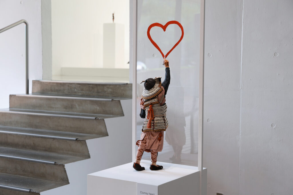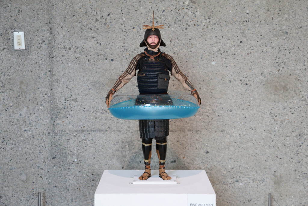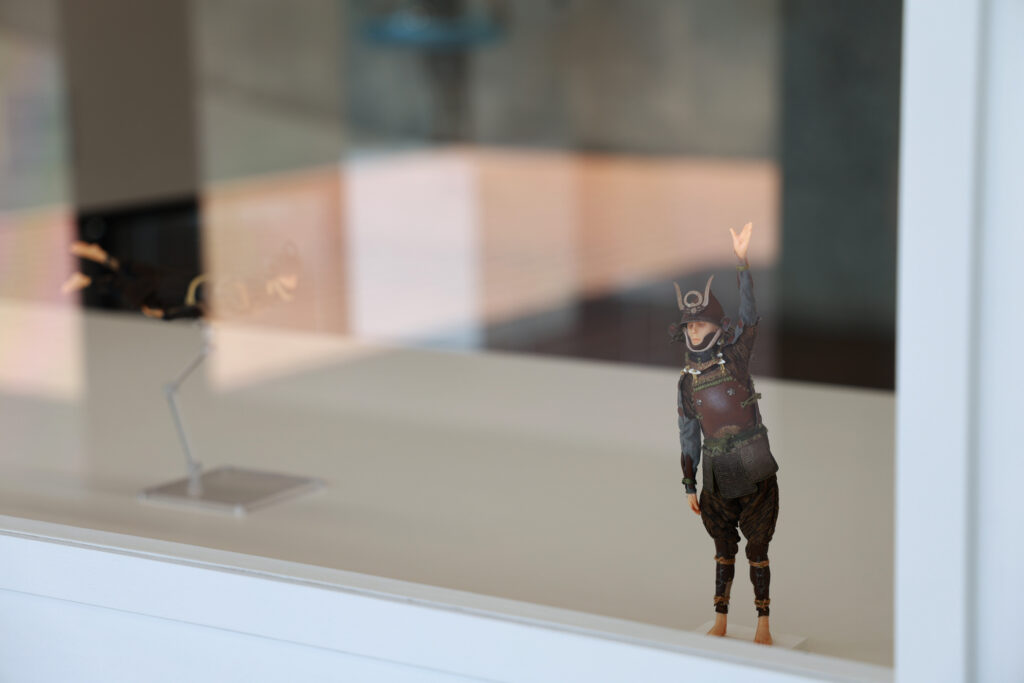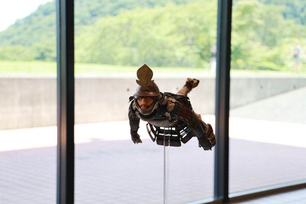 野口氏の作品は、一見すると歴史の重みを感じさせる鎧と人間だが、その素材は樹脂やアクリルといった現代的なものが使われている。氏は鎧を単なる過去の装束としてではなく、「人間が肉体を守るために作ったプロダクト品」と捉え、そこに現代を生きる我々にも通じる普遍的な人間の姿を映し出している。