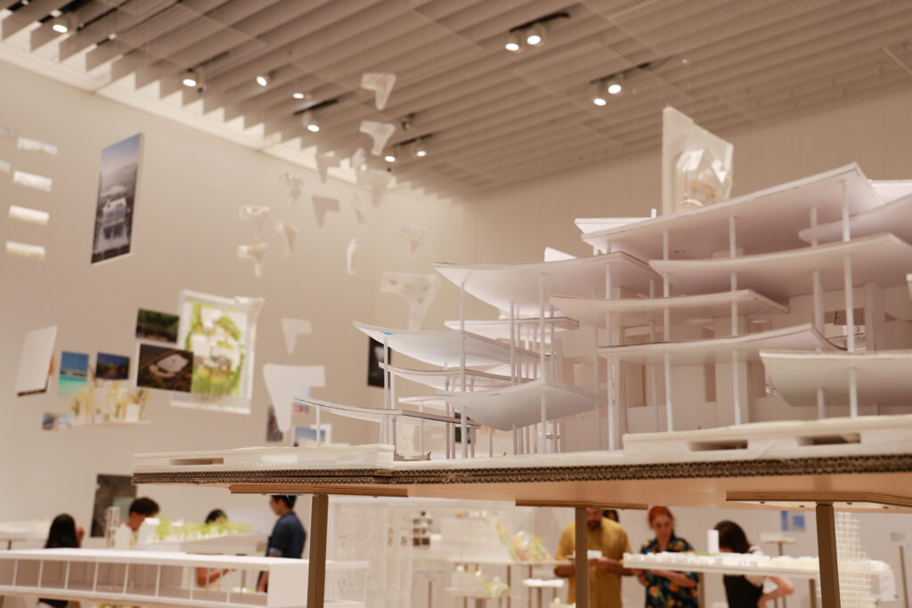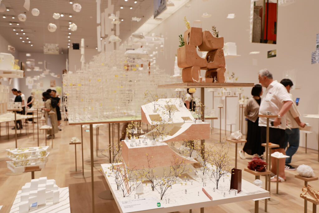 本展は、建築という枠組みを軽やかに超えていく試みに満ちている。異分野の専門家との協働:建築史家の倉方俊輔氏、ブックディレクターの幅允孝氏、データサイエンティストの宮田裕章氏といった、多様な分野のプロフェッショナルとコラボレーションしている。知性が交差する展示空間:幅氏が選書した「あわいの図書室」 や、宮田氏と考案した「未来の森」の都市像など、建築家の思考が他分野の知性と交わることで、より豊かで複層的な空間体験を生み出している。