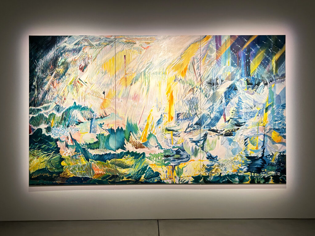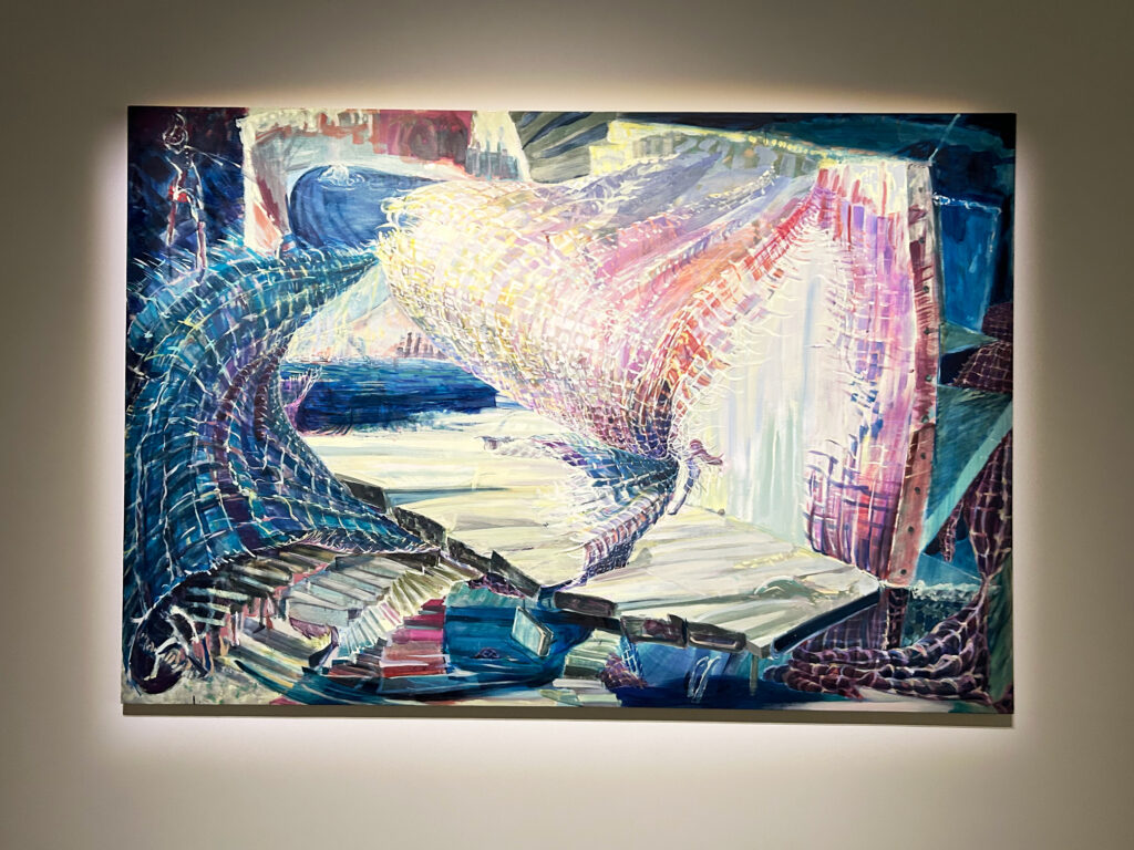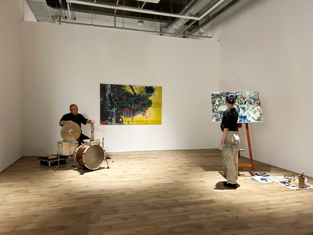ライブパフォーマンスは終了したが、上田氏の作品には音楽的な要素、つまり「リズム」や「グルーヴ」が宿っている。力強い筆致の連なり、色彩の響き合い、そして画面全体の構成が、まるで一つの楽曲のようなリズムを生み出している。オープニングでのパーカッショニストとの共演は、そもそもアーティストの作品が内包する音楽性を象徴する出来事だったと言えるだろう。加筆された絵は、本展の一部として展示されている。