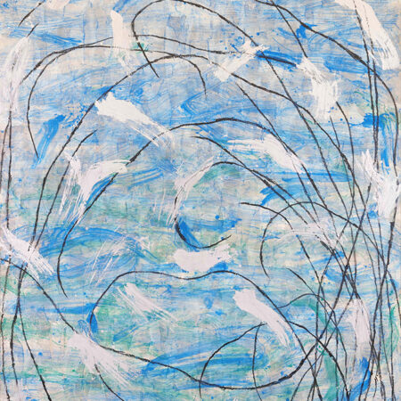展覧会タイトル「Fishing as a Mole Does – Until Stone Becomes Water –『もぐらのように釣りをする – 石が水になるまで –』」は、上田の制作プロセスを象徴的に表している。視覚に頼らず土を掘り進むもぐらのように、あらかじめ「何をどう描くか」を決めずに描き始める姿勢。