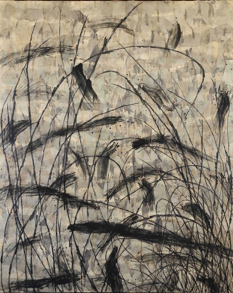 墨、岩絵具、油性マーカー、アルミ粉、和紙。多様な素材が織りなすテクスチャーの共鳴。その複雑な肌理(きめ)に触れるような鑑賞体験が、ここにはある。